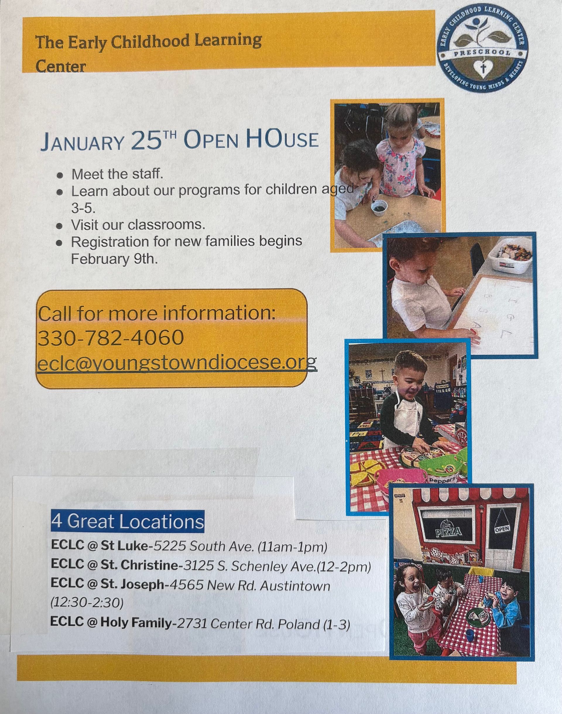 As part of the ministry of education in the Diocese of Youngstown, the Early Childhood Learning Center is committed to diversity, open to children of all faiths and serves the entire Mahoning Valley. Children from ages 3 to 6 years old, are provided with age-appropriate instruction, in keeping with the Ohio Department of Education Early Learning Standards. The curriculum is further enriched with opportunities for technology formation, exploration of the arts and introduction to foreign language skills. The aftercare program is designed upon an active learning environment. Together with professional staff and dedicated parents, the Early Childhood Learning Center provides a safe, faith-filled environment that prepares children to achieve not only academic success but also their full social potential.